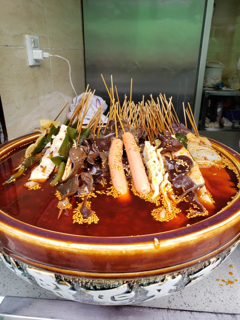 A specialty spread throughout China is the Sichuan Hotpot. This is a kind of fondue. A broth is placed in a large, usually iron pot in the middle of the table. Spicy broths with chili peppers and Sichuan pepper are the most common, but there are alternatives such as tomato, mushroom, chicken, clear, or other types of soups. There are also pots „with separation“ so that 2 or more broths can be ordered in one pot. As soon as the broth is bubbling, ingredients are added to the broth and cooked. As soon as they are cooked, they are taken out of the pot, dipped in a self-mixed sauce and eaten. The sauces vary depending on the region, in the north, creamy sesame sauce is often chosen, in the south people prefer sesame oil. Chopped cilantro, spring onions, chopped peanuts or sesame and garlic are added according to personal taste. There are no limits to the imagination when it comes to the ingredients that can be cooked in the hotpot: