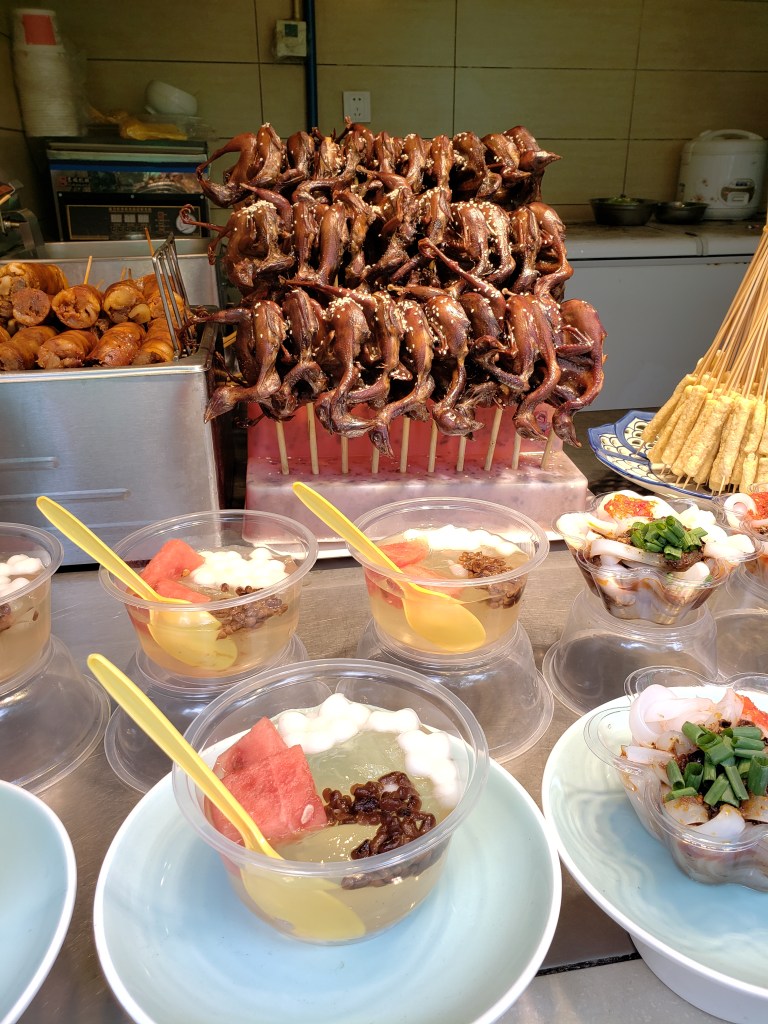 Unweit des Tempelkomplexes besuchten wir eine Fussgängerzone namens Jinli-Strasse (锦里古街). Ich habe festgestellt, dass jede chinesische Stadt, die Touristen anzieht, eine oder mehrere zentral gelegene Fussgängerzone hat. Dort reihen sich in der Regel Souvenir-Läden, Restaurants, Bars, Snack-Geschäfte aneinander und Strassenverkäufer wuseln herum. Egal wo ich in China war: Einige Arten von Läden wiederholten sich immer wieder. Ich versuchte immer, die lokalen Spezialitäten herauszufiltern und zu probieren. Solche Fussgängerzonen waren normalerweise sehr gut besucht, an Feiertagen teilweise unerträglich überfüllt.