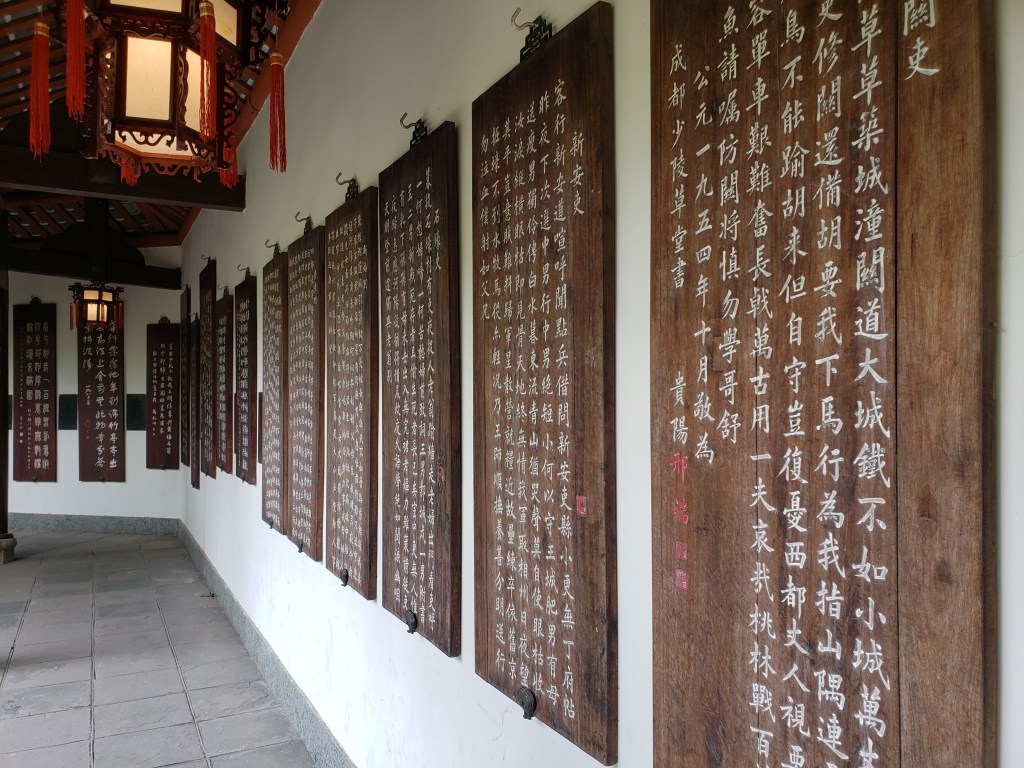 Auch besuchten wir ein dem chinesischen Dichter „Du Fu 杜甫“ gewidmeten Museumsgelände. In meiner Zeit in China und im Chinesischunterricht habe ich immer mal wieder von diesem Dichter gehört. Jedes chinesische Kind lernt in der Schule Gedichte von Du Fu auswendig. 759 zog der Poet nach Chengdu und lebte in einfachen Verhältnissen – er baute eine Strohhütte (杜甫草堂), die an ein Reetdachhaus erinnert. Er lebte dort 4 Jahre und schrieb über 200 Gedichte. Die Hütte wurde renoviert und zum National-Erbe ernannt, und zieht daher viele Touristen und Dichter-Fans an.