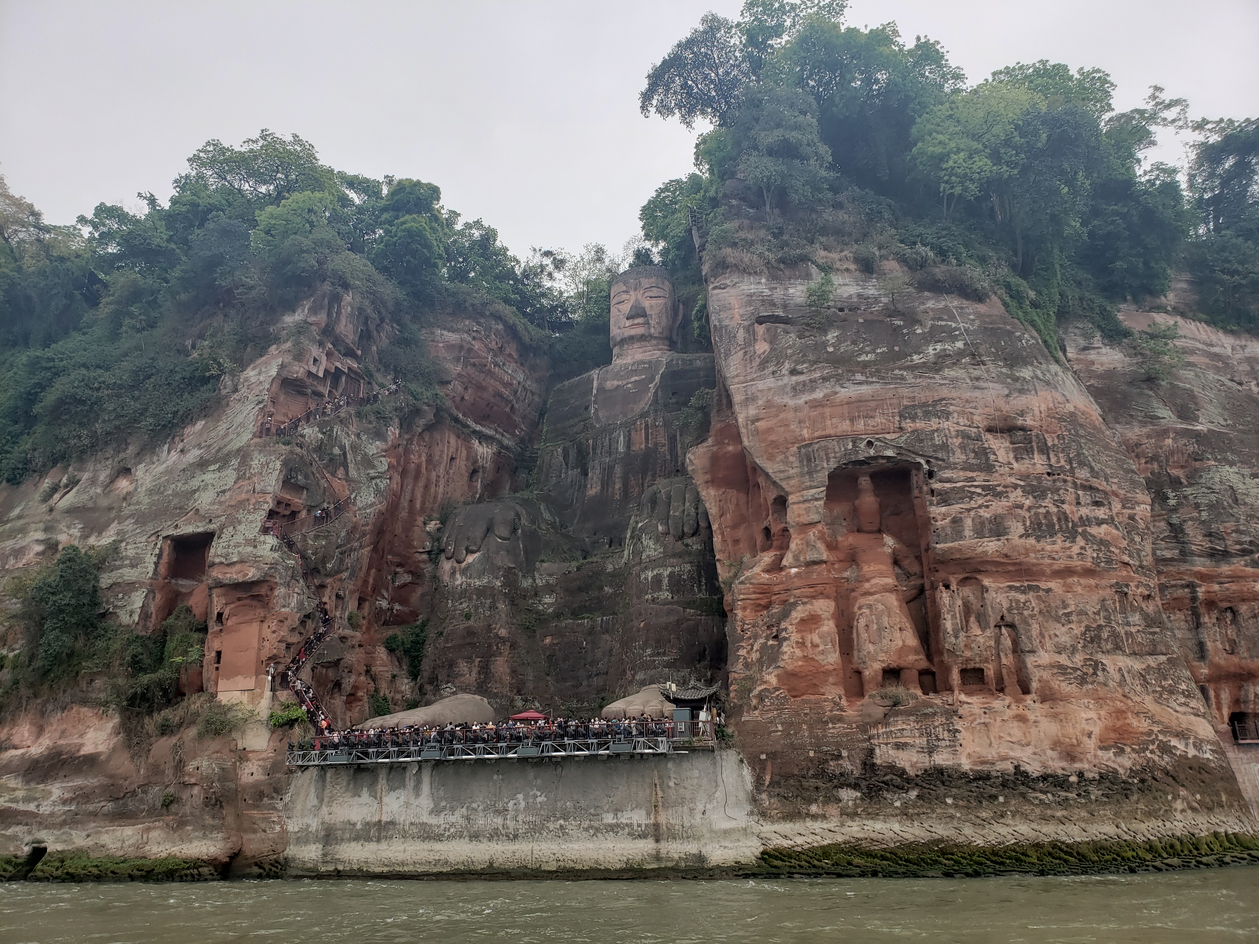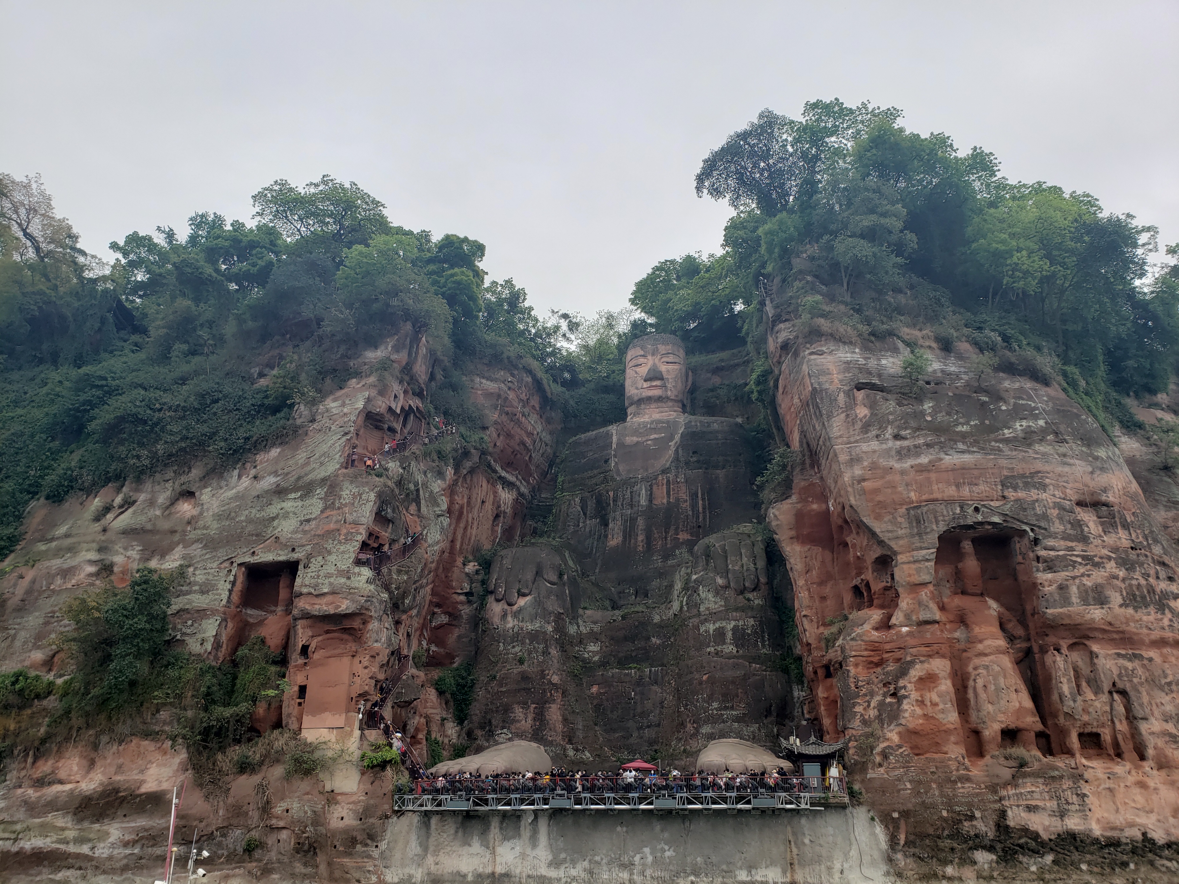 Ein Tagesausflug führte uns zu einer Attraktion circa 2 Fahrstunden von Chengdu entfernt. Dort trohnt ein 71m hoher und 28m breiter, aus dem Felsen gemeisselter Stein-Buddha, der „Leshan Big Buddha“. Der Buddha befindet sich an einer Stelle, wo 3 Flüsse (Minjiang, Dadu und Qingyi Fluss) zusammenfliessen. Er blickt auf den Berg Emei, der einer von China’s vier heiligen Berge des Buddhismus ist (四大佛教名山, Sìdà Fójiào Míngshān) und ist seit 1996 UNESCO-Weltkulturerbe. Der Buddha soll der weltgrösste sitzende Buddha sein.