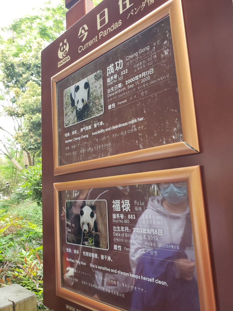 Pandas sind das nationale Kulturgut Chinas. In Chengdu gibt es die grösste Forschungs- und Aufzuchtstation für Grosse Pandas. Die Einrichtung wurde im Jahr 1987 mit sechs Großen Pandas gegründet, die aus der Wildnis gerettet wurden. Heute leben dort über 150 Pandas unter natürlichen Bedingungen. Die Zucht von Pandas ist sehr aufwändig – ein Panda-Weibchen ist nur 72 Stunden/Jahr empfängnisbereit. Somit investiert die chinesische Regierung sehr viel Geld und Mühe in die Erhaltung ihrer Pandas. Die Tiere werden umhütet, jeder Panda hat einen Namen und eine Beschreibung des Charakters.