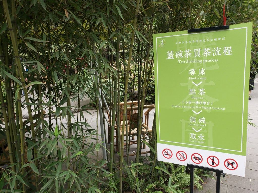 Innerhalb des Komplexes gibt es ein sehr bekanntes Tee-Haus. Wie überall in China hat in Chengdu das Tee-Trinken hohen Stellenwert. Es gibt viele Teehäuser und auch in diesem Kloster gibt es einen grossen Freiluft-Bereich, in dem Menschen zum Teetrinken zusammenkommen. Ein Schild am Eingang erklärt die Reihenfolge für unwissende Touristen. 😉
